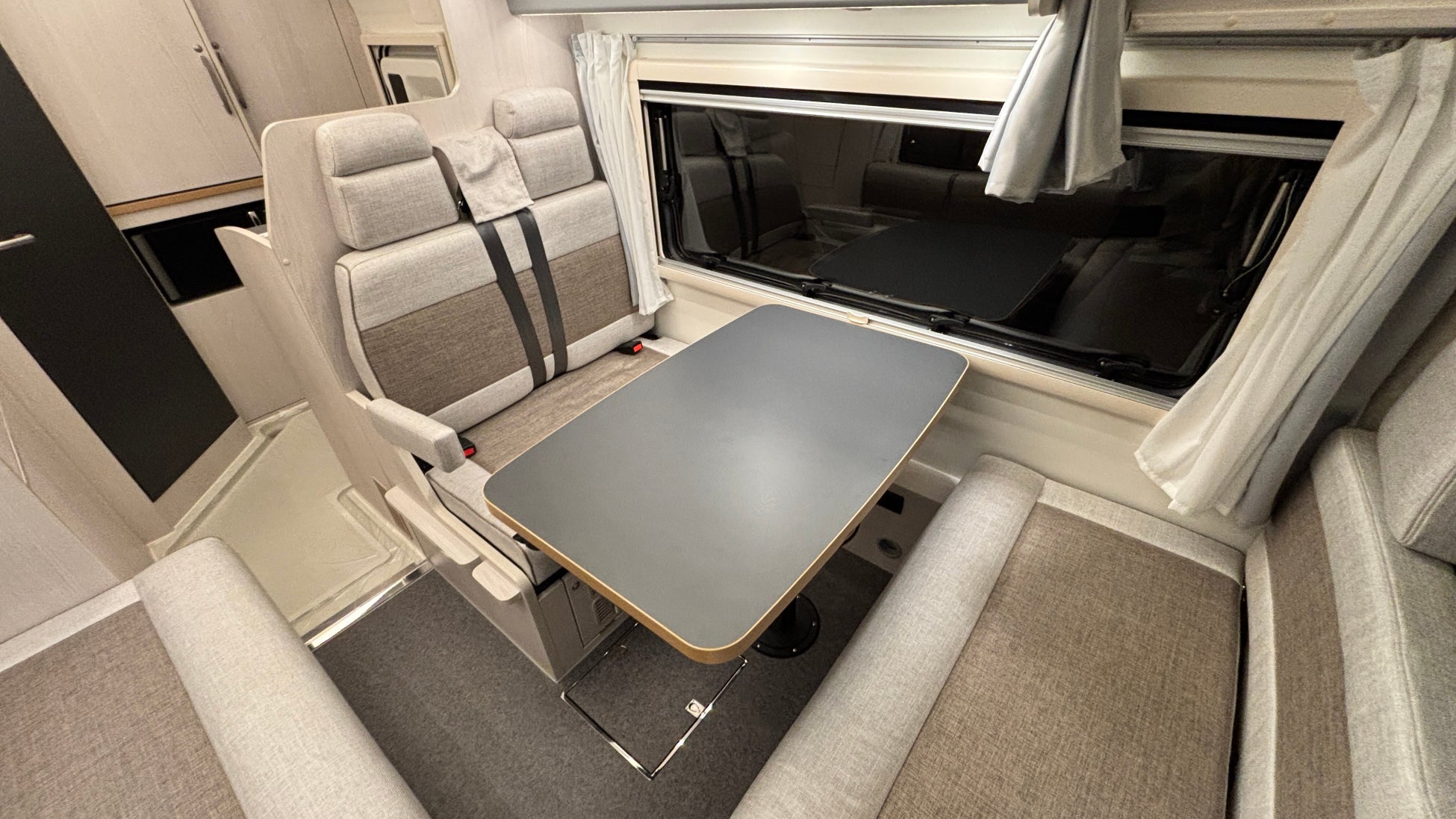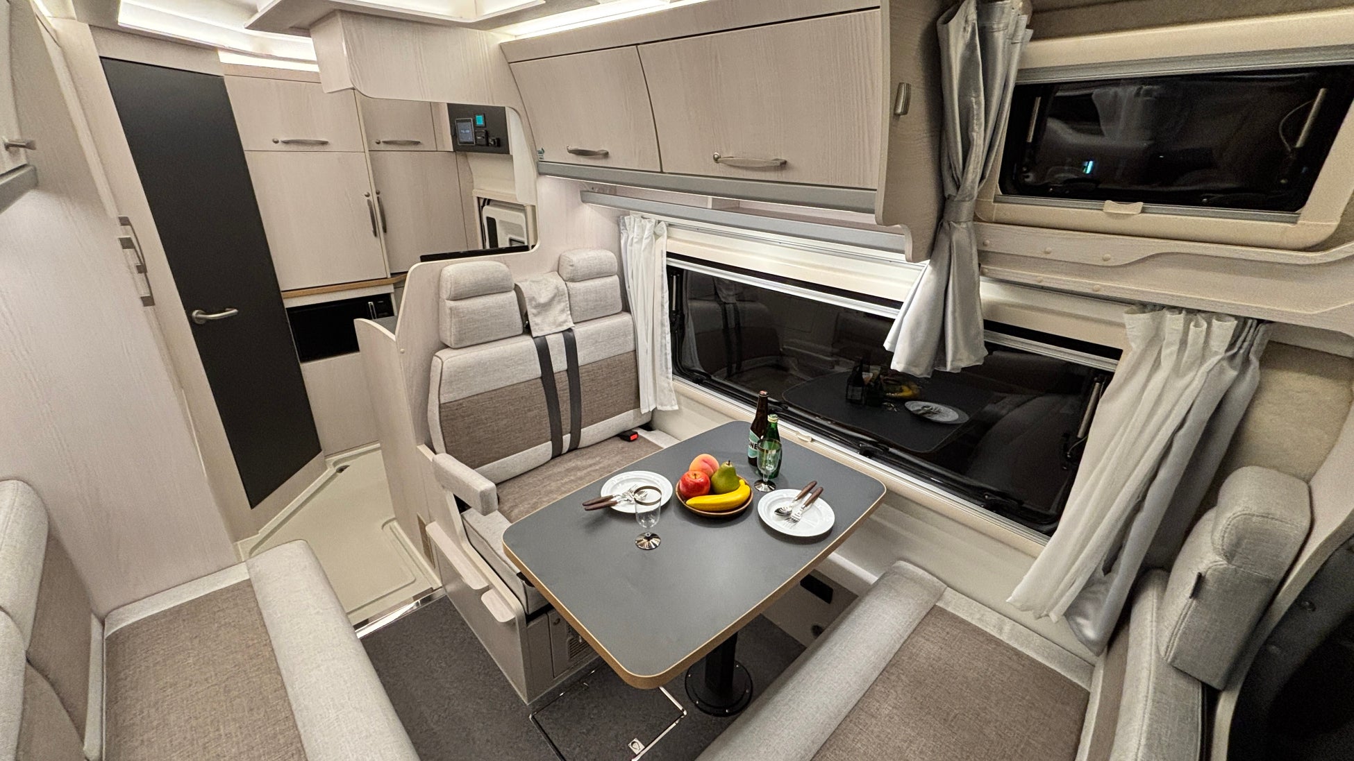 ギャレーを後方側にまとめることで、ダイネットテーブルを三方向から囲むコの字ダイネットを実現。ファミリーでもグループでも自然に顔を合わせられる、居心性の良いダイネット空間が生まれました。