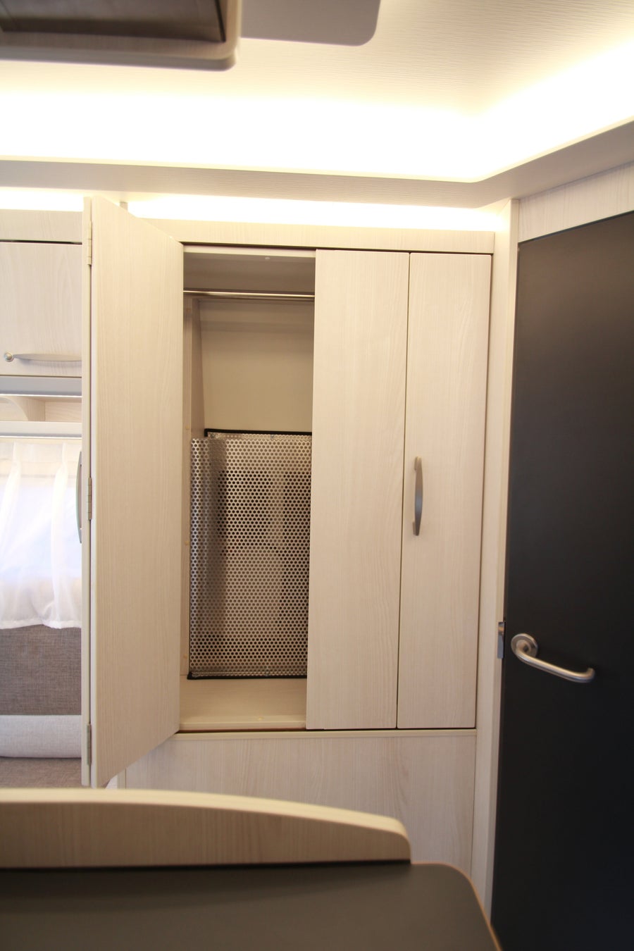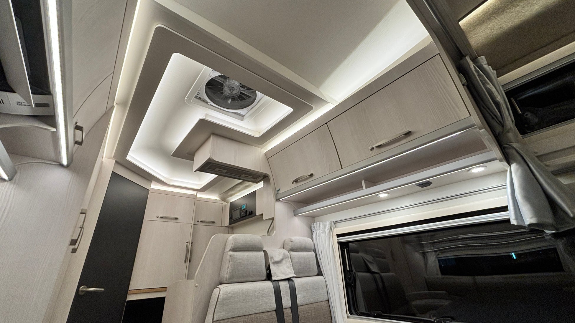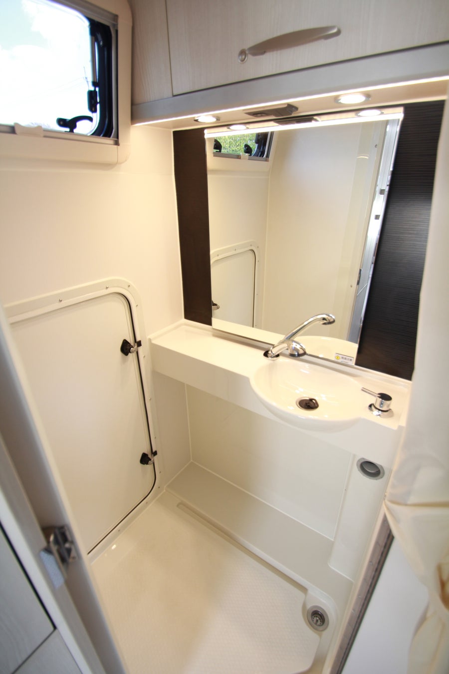 マルチルーム:天井にはベンチレーター、床には防水シャワーパンを装備。側面にはミラーと収納棚を設置し、温水シャワーが使用可能。オプションのカセットトイレも設置できます。外部アクセスドアにより荷物の出し入れも行えます。