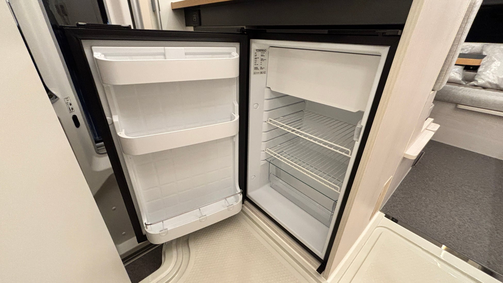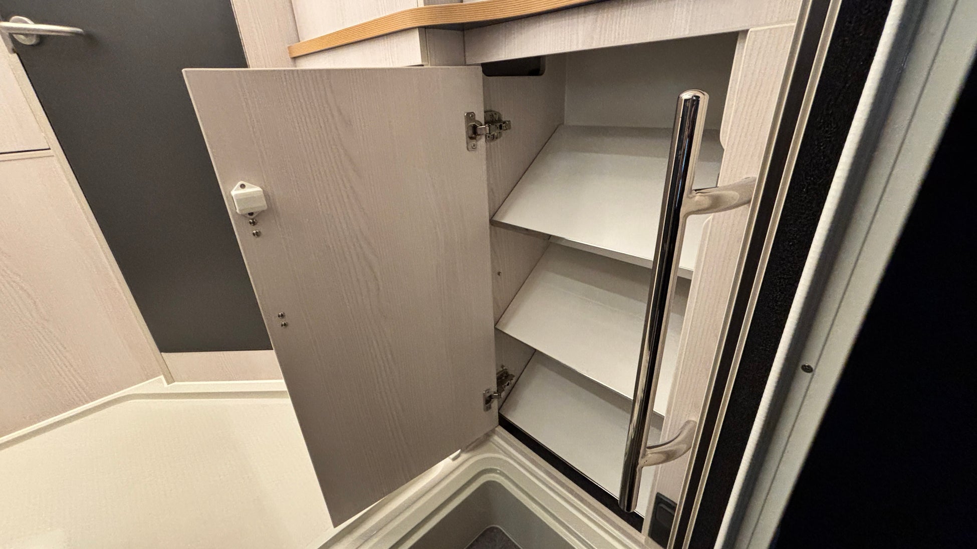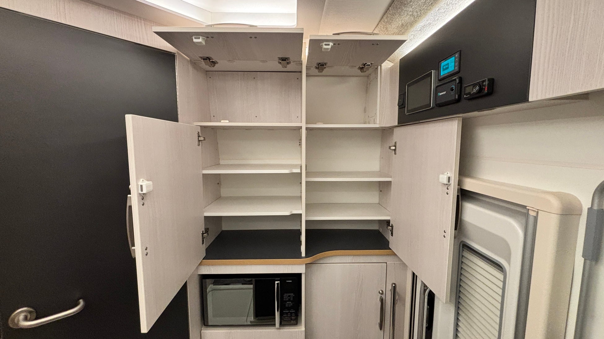 マルチルーム:天井にはベンチレーター、床には防水シャワーパンを装備。側面にはミラーと収納棚を設置し、温水シャワーが使用可能。オプションのカセットトイレも設置できます。外部アクセスドアにより荷物の出し入れも行えます。
