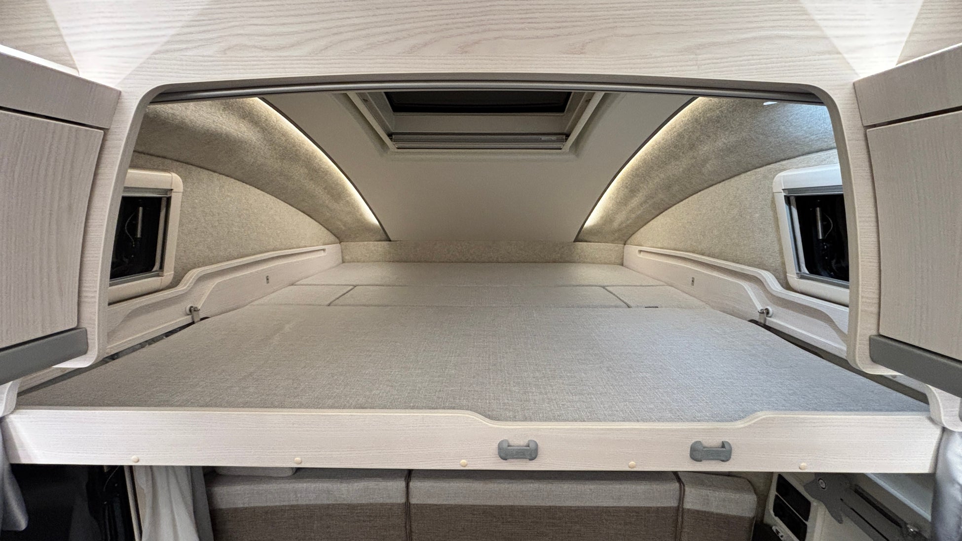 スカイライトルーフ:夜空を眺めながら眠りにつける人気のオプション。自然光を取り入れて車内を明るくし、換気にも役立つ。網戸とブラインドも備え、用途に応じて調節できます。