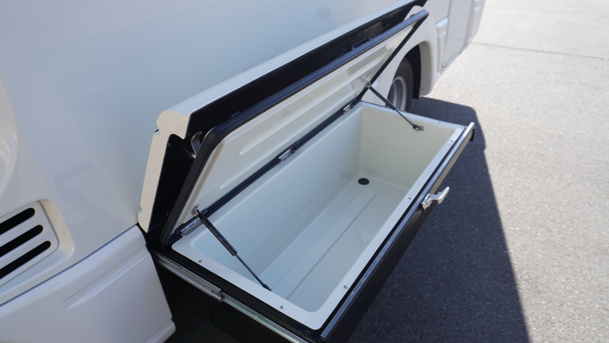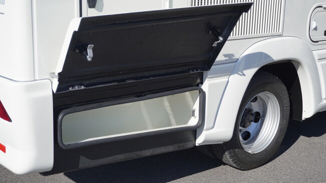 リア左側には引き出し式外部収納庫を配置。防水仕様のため、雨天時でも内部に水が溜まる心配はありません。約132Lの大容量を確保し、耐荷重は100kgまで対応。キャンプやアウトドア用品等、余裕を持って積載できる頼もしい収納庫です。