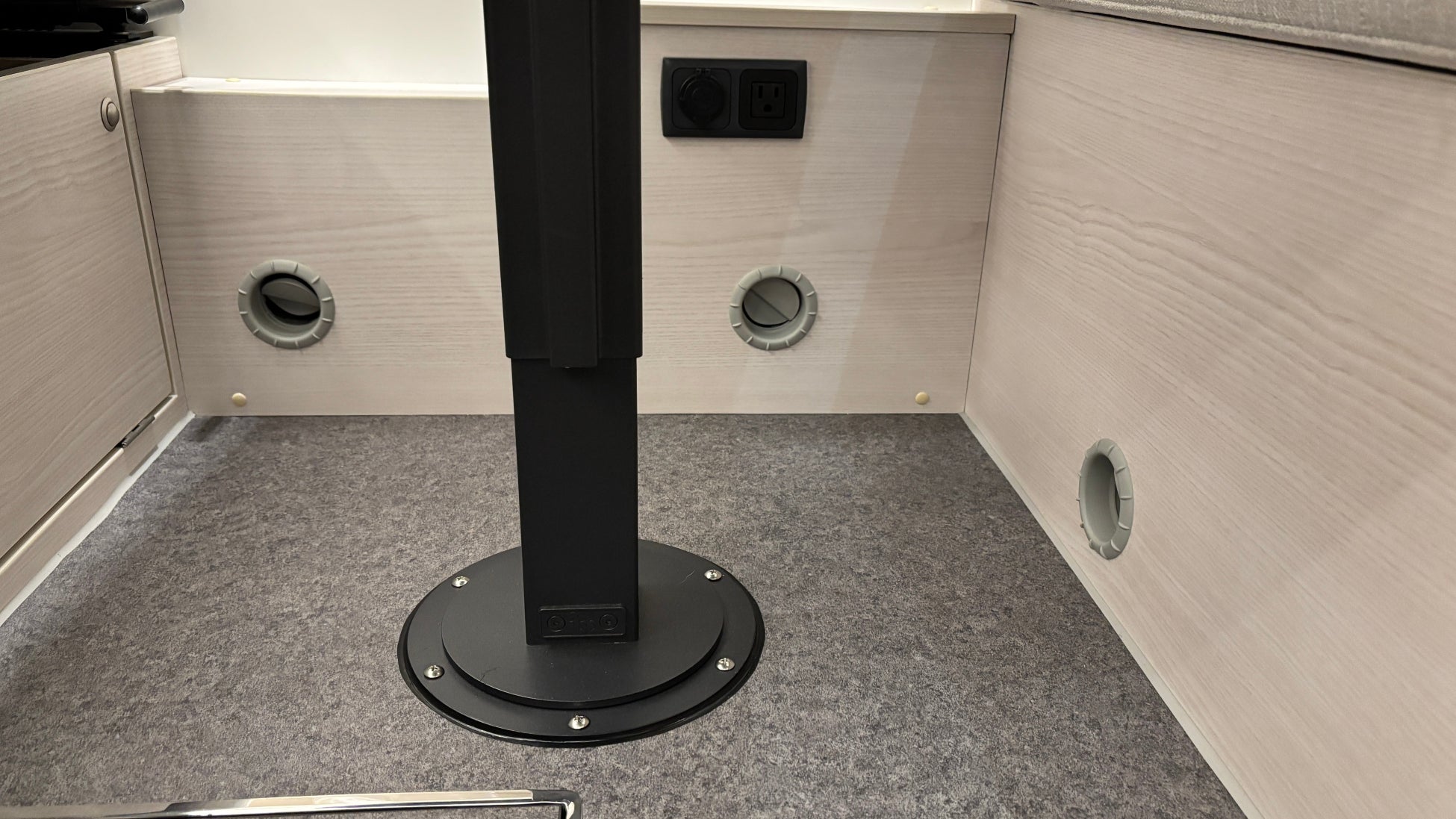 テーブル:高さ調節とスライドが可能なマルチ昇降・スライド式の大型テーブル。足元にはスマートフォンを充電できるコンセントを配置。さらに温風ヒーター吹き出し口もあり、床暖房と併せて足元から暖かい。