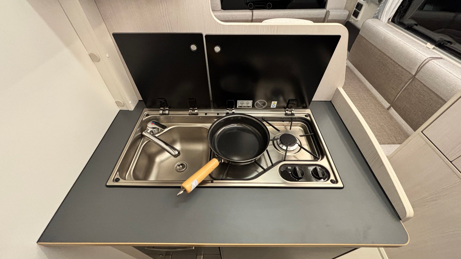 ステンレスシンク&2バーナーコンロ:ステンレスシンクと2バーナーコンロを一体化したユニットを採用。汚れに強く手入れしやすい。使用しない時は、耐熱ガラスカバーを閉めるとフラットになり調理台スペースを広げられます。