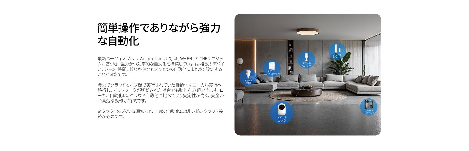 さらに、Aqara Homeでは新バージョンの自動化を導入しており、業界でもトップクラスの強力なオートメーションエンジンを備えています。WHEN‑IF‑THEN条件とアクションを直感的に組み合わせるだけで状況に合わせた家電の制御ができるので、スクリプトやデバッグに時間をかけずに自宅を完全自動化できます。