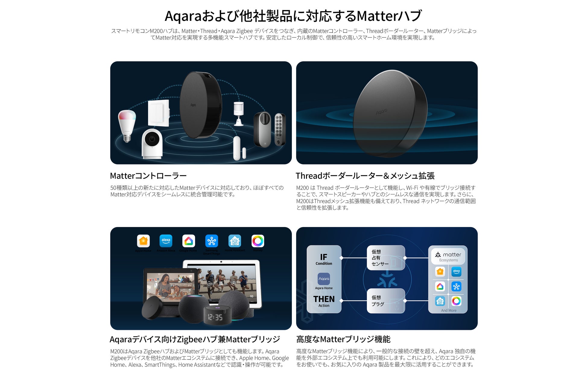 スマートリモコンM200ハブはAqara ZigbeeハブおよびMatterブリッジとしても機能します。Aqara Zigbeeデバイスを他社のMatterエコシステムに接続でき、Apple Home、Google Home、Alexa、SmartThings、Home Assistantなどで認識・操作が可能です。