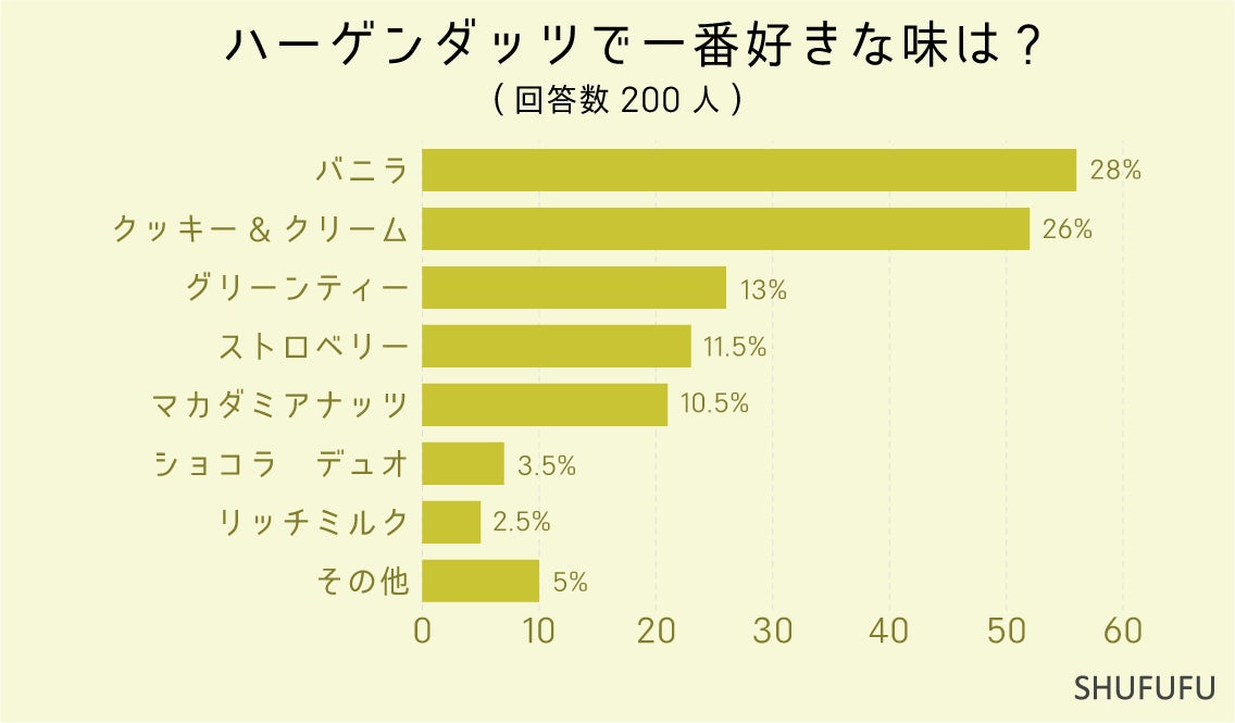 ハーゲンダッツで一番好きな味は?の問いに対して最も多かったのが「バニラ(28%)」でした。 次いで「クッキー&クリーム(26%)」「グリーンティー(13%)」という結果でした。 1位のバニラと2位のクッキー&クリームで半数以上を占めるので人気の高さが伺えます。