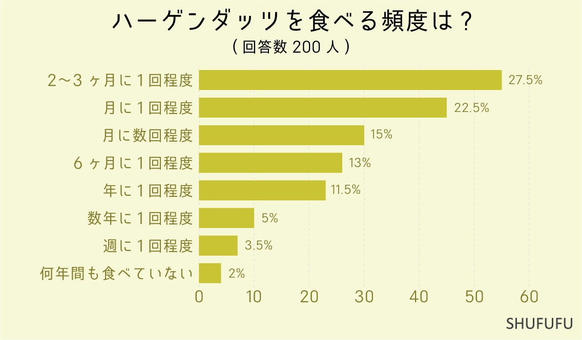 ハーゲンダッツを食べる頻度は?の問いに対して最も多かったのが「2〜3ヶ月に1回程度(27.5%)」でした。 次いで「月に1回程度(22.5%)」「月に数回程度(15%)」という結果でした。 約70%の人が数ヶ月に1回はハーゲンダッツを食べている計算になりますね。