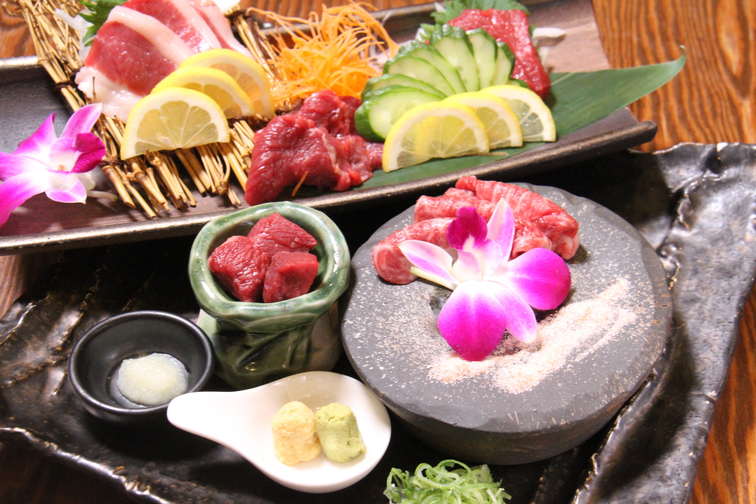 特に自信をもってご提供する馬刺しは、鹿児島県・佃牧場から直接仕入れています。新店舗オープンに向け、鹿児島県・知覧町にある佃牧場にオーナーだけでなく店長、料理長が足を運び、屠畜(とさつ)現場なども見せていただき勉強させていただきました。
