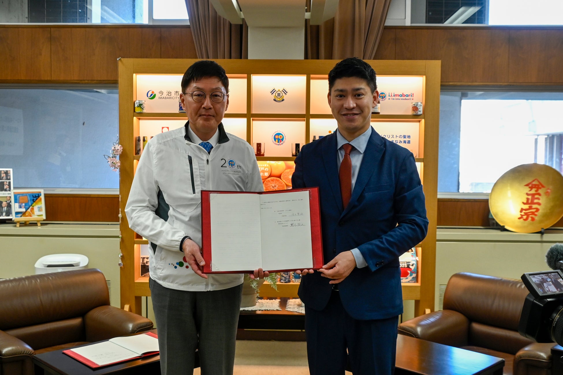 同日、今治市庁舎において、㈱ACSL代表取締役CEO鷲谷聡之様と徳永繁樹今治市長によって協定書への署名が行われました。