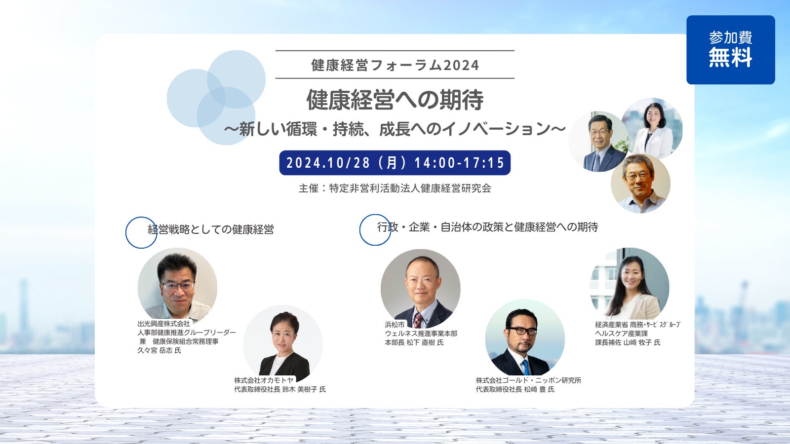 本フォーラムでは、「経営戦略としての健康経営」、「行政・企業・自治体の政策と健康経営への期待」をテーマに、企業・自治体・サービス事業者等様々な立場から「これからの健康経営への期待」についてお話しをいただきます。