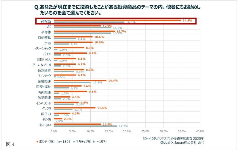 他者に勧めたい投資テーマについては、ポジティブ組の34.8%が「高配当」と回答しました。次いで、「半導体(16.7%)」、「金融関連(14.4%)」、「AI(12.9%)」と続く結果となりました。昨今話題となっているテーマについて注目していることが分かります(図4)。