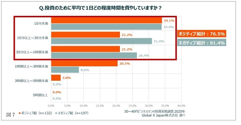 投資のために費やしている時間は、ポジティブ組の約8割が1時間未満の結果でした(図7)。