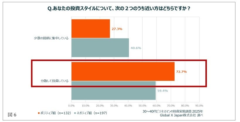 主な銘柄の保有期間については、ポジティブ組の83.3%が長期投資(1年超)を行っており、ネガティブ組の62.9%を大きく上回っています(図5)。また、投資スタイルについてはポジティブ組の72.7%が分散型と回答しており、ネガティブ組の59.4%を大きく上回っています(図6)。