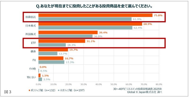 一方、投資信託(ポジティブ組は75.8%、ネガティブ組は61.9%)とETF(ポジティブ組は31.1%、ネガティブ組は18.3%)において、ポジティブ組とネガティブ組の活用割合の差が、他商品と比較して相対的に大きい結果となりました。(図3)。