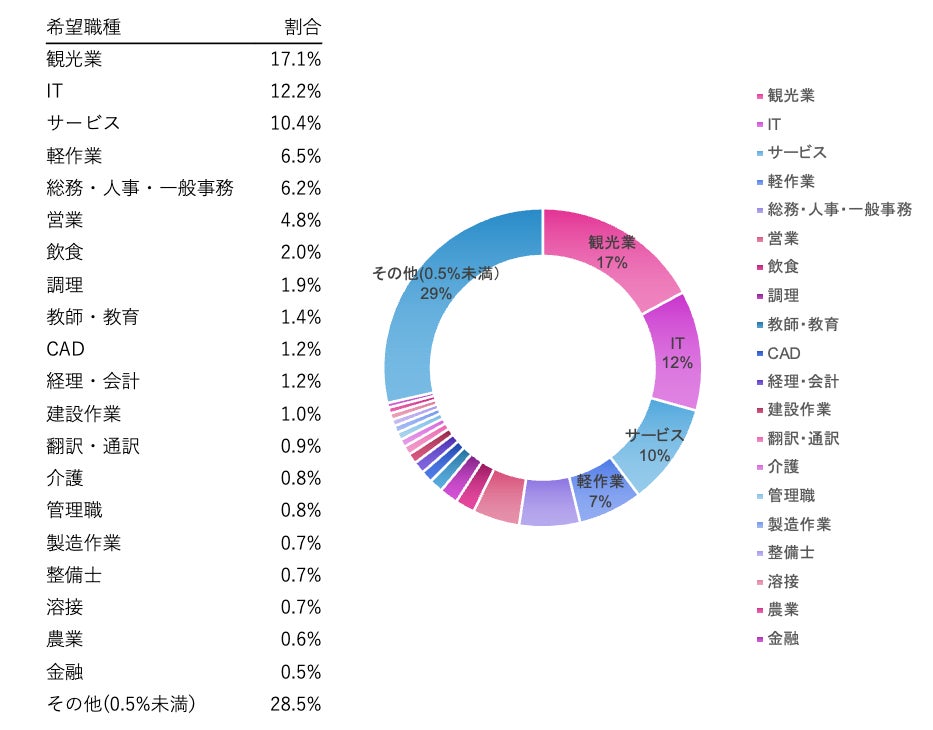 求職者側の希望職種で最も多かったのは「観光業」(17.1%)。訪日観光の回復を受け、語学力を活かせる業界への関心が高まっています。次いで「IT」(12.2%)、「サービス業」(10.4%)と続き、多様な分野への就職ニーズが見られました。