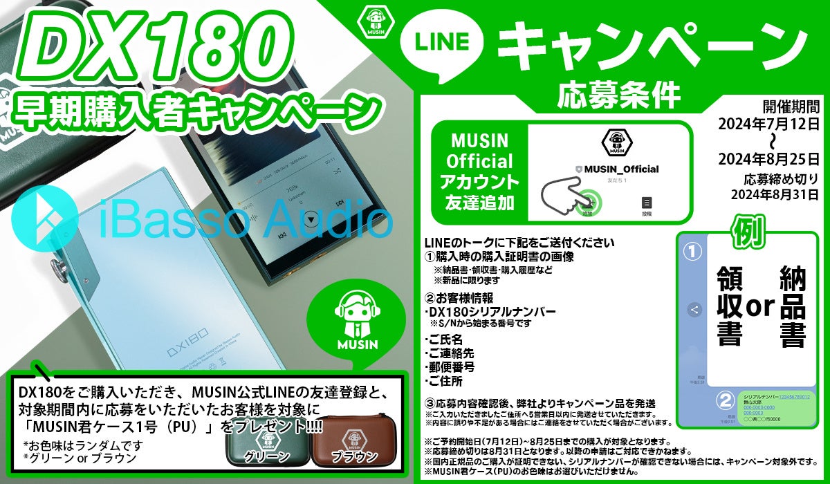 7月12日(金)から8月25日(日)の対象購入期間にて、iBasso Audio DX180を国内正規流通店舗より、ご購入いただいたお客様を対象に「DX180早期購入者MUSIN君ケース1号プレゼントキャンペーン」を実施いたします。