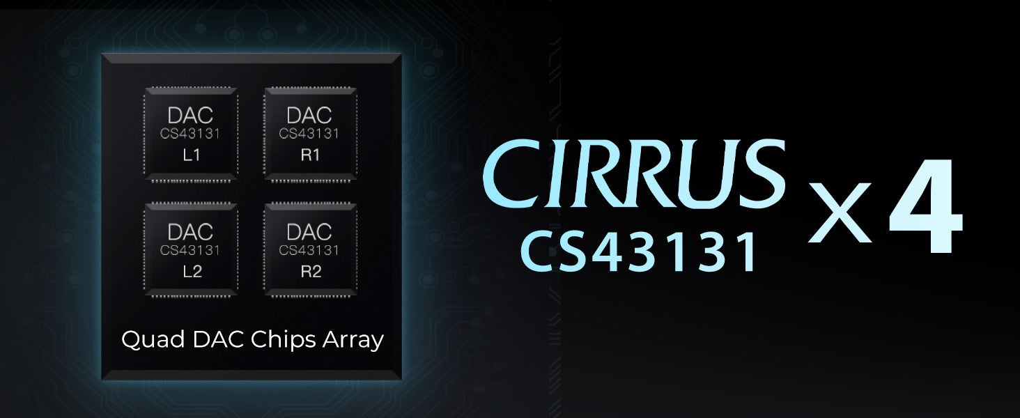 4基の「CS43131」がシンクロして駆動することで、ダイナミックレンジ:133dB、THD+N:-121dBというサウンドスペックを叶え、優れた技術と独自の設計コンセプトにより実現された、卓越したサウンドスペックです。