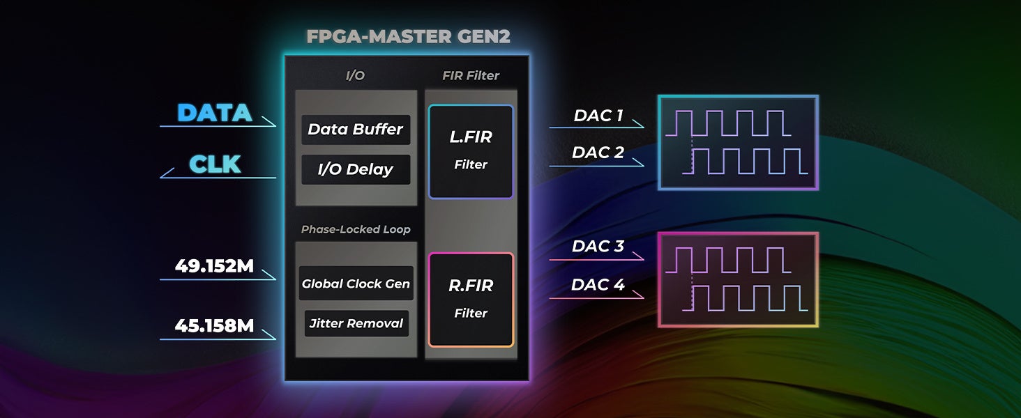 FPGA-MASTER 2.0は、ピコ秒レベルの精密な制御も可能であり、DACのクロック、データ調整・制御、そして、重要なFIRフィルターの構築を実行しています。