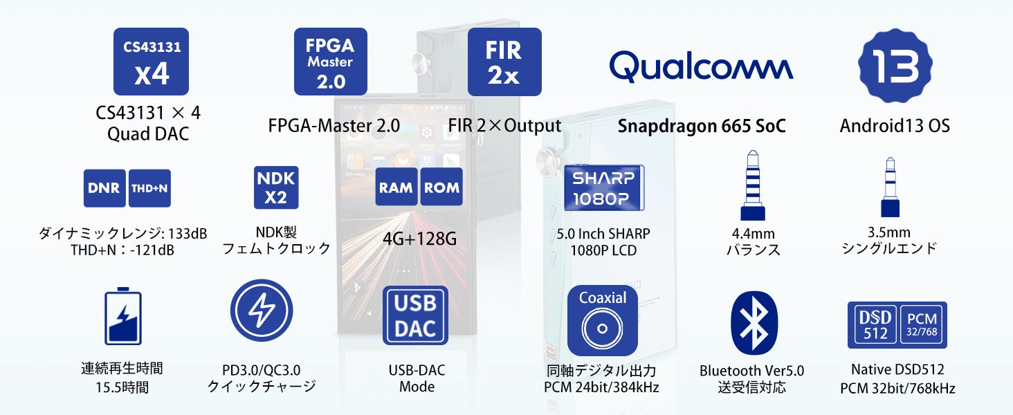 前期種のDX170からはSoCスペックも大幅な見直しを行い、SoCにはQualcomm Snapdragon 665 SoCを採用し、OSにはAndroid 13システムを搭載し、システムレベルでSRCをバイパスすることで、専用アプリケーションやユーザーによるお好みの音楽再生アプリケーションでも、”Non-SRC”機能によるフルスペックサウンドを楽しむことが可能になっています。