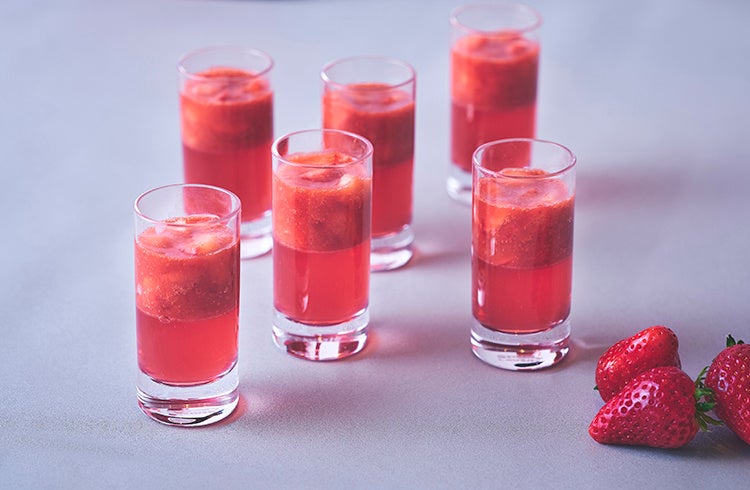 華やかなロゼスパークリングワインの香りと、みずみずしいイチゴを閉じ込めたキューブ型ゼリー。ロゼスパークリングワインの上品な風味とイチゴの甘さが口の中で広がります。