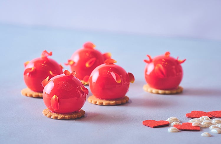 マドレーヌビスキュイにフォレストベリーゼリーと抹茶ババロアをあわせました。ハートをあしらったかわいらしいビジュアルとともにお楽しみください。