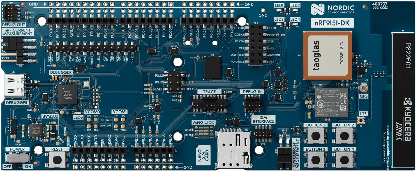 nRF9151 DKは、LTE-M、NB-IoT、GNSS、DECT NR+向けnRF9151 SiPの評価および開発用の、低価格の認証済みシングルボード開発キットです。LTE-M、NB-IoT、DECT NR+専用アンテナを備えており、幅広いバンドに対応し、世界中で運用することが可能です。