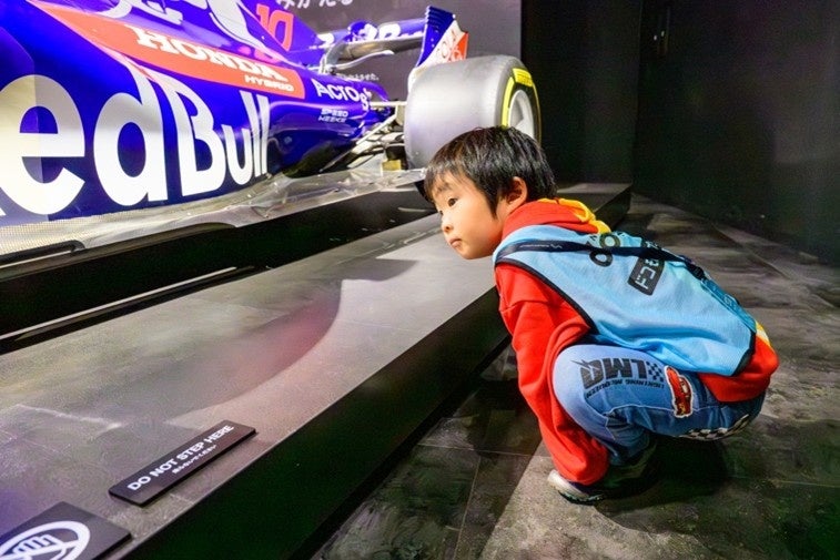 展示エリアでは、F1マシンの歴史や、ドライバーの安全を守るために進化してきたボディ構造・素材の工夫についてスタッフから説明がありました。子どもたちは、展示された実物の車体を間近で見ながら、「ピカピカでかっこいい!」「新幹線よりも速いんだね!」と興味津々。
