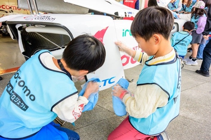 チームスタッフの指導のもと「カウル磨き体験」と「マネージャー体験」を実施。カウル磨き体験では、メカニックスタッフからの「マシンをきれいに保つことも、勝つために大切な仕事なんだよ」というお話とともに、磨き方のコツをレクチャーいただきました。子どもたちは手袋をはめ、一生懸命に、そしてマシンを傷つけないよう丁寧にクロスで表面を磨き上げていきます。