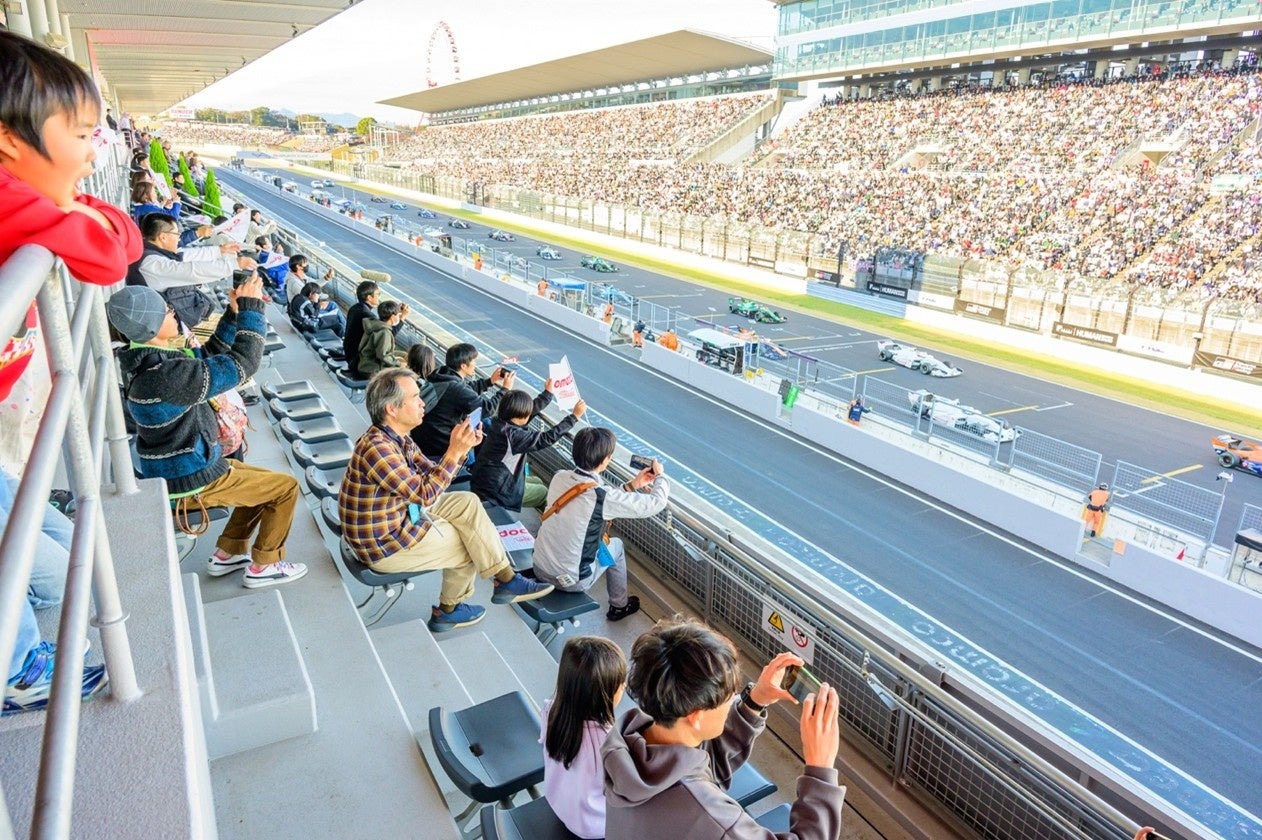 マシンがスタートラインを飛び出すと、子どもたちは手に持った応援フラッグを一身に振り、「がんばれ!」「抜いた!」と声をそろえて応援。ホスピタリティクラブの観覧席に座り、時速300キロを超えるマシンが駆け抜けるたびに歓声が上がりました。