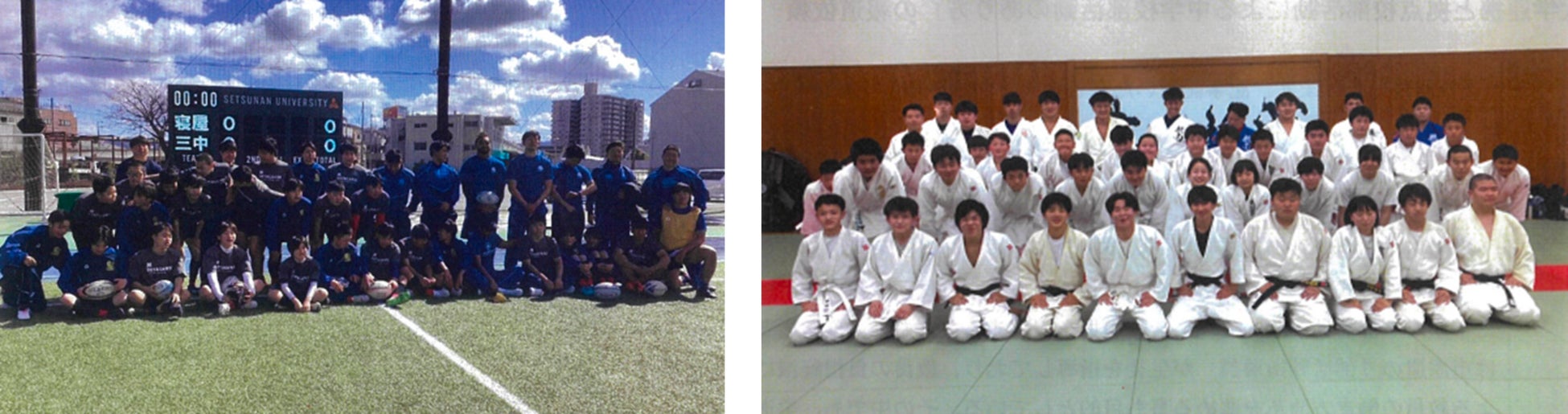 本学ではスポーツ振興と学生の実践力向上を目指し2023年4月より週に1度、柔道部が寝屋川 市立の中学校と合同で練習を行っています。また今年4月から、ラグビー部でも同様の取り組みを始 めました。本取り組みにより、中学生は整備された環境で部活動やハイレベルな競技指導を受けることができ、本学の学生にとってもリーダーシップ力が高まり、競技指導の実戦経験を積むこともできます。さらに、本学との連携を通して部活動指導を行うことにより中学校教員の負担軽減につなが り、働き方改革の一助にもなっています。