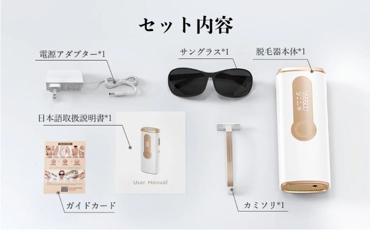 同梱物:光美容器本体、電源アダプター、サングラス、カミソリ、取扱説明書、ガイドカード