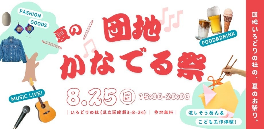 内覧会同日に、「いろどりの杜」にて夏イベントを開催します。こちらにも是非遊びにいらしてください。イベントでは全長約5mの流しそうめんや地域のお店によるグルメやショッピング、音楽ライブを楽しむことができます。(15時~20時)