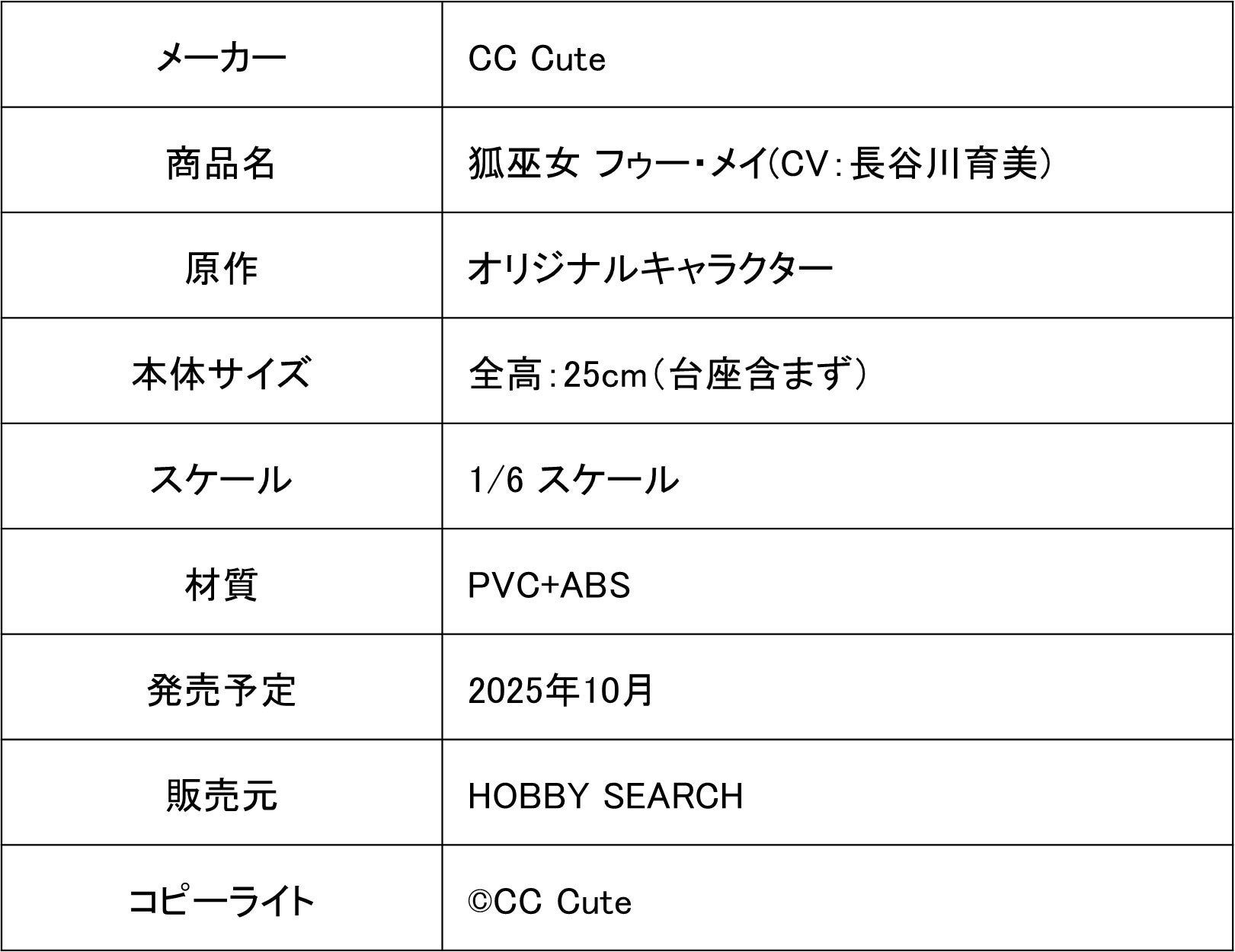 株式会社ホビーサーチ(東京都墨田区 代表取締役社長:川畑 泰史)は、CC Cute【赋有(武汉)动漫设计有限公司】より2025年10月発売予定のオリジナルフィギュア『狐巫女 フゥー・メイ』のキャラクターボイス(CV.)として数々の人気アニメ・ゲームに出演中の声優:長谷川育美さんに決定したことをお知らせいたします。また今後のプロモーションを実施していく情報集約の場所として『狐巫女フゥー・メイ』特設サイトを公開することをお知らせいたします。