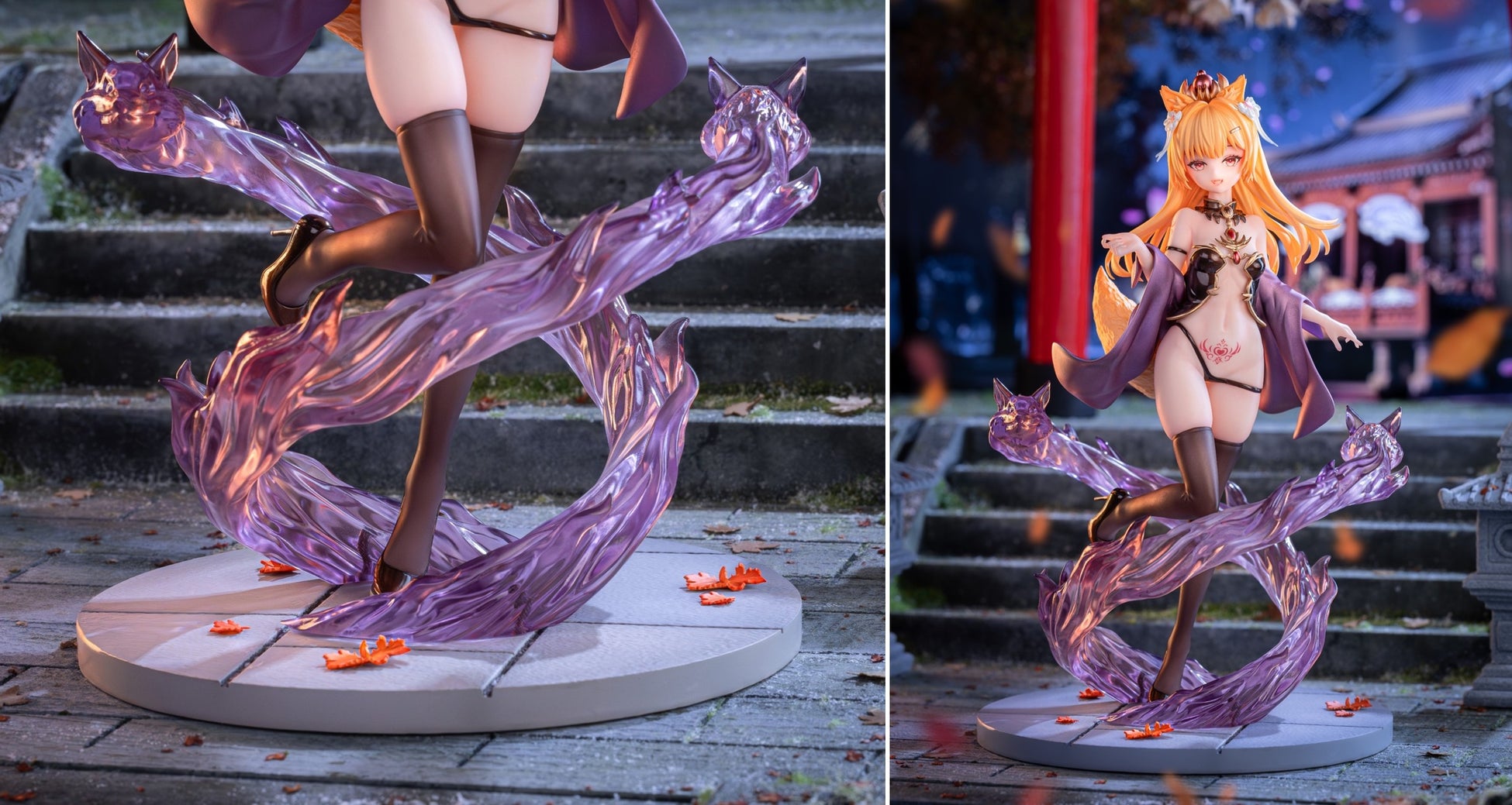 台座は神社の石畳と紅葉を忠実に再現。秋の夜長とともに『狐巫女フゥー・メイ』をお楽しみください。ホビーサーチ限定特典になりますので、ぜひこの機会にご購入ください。