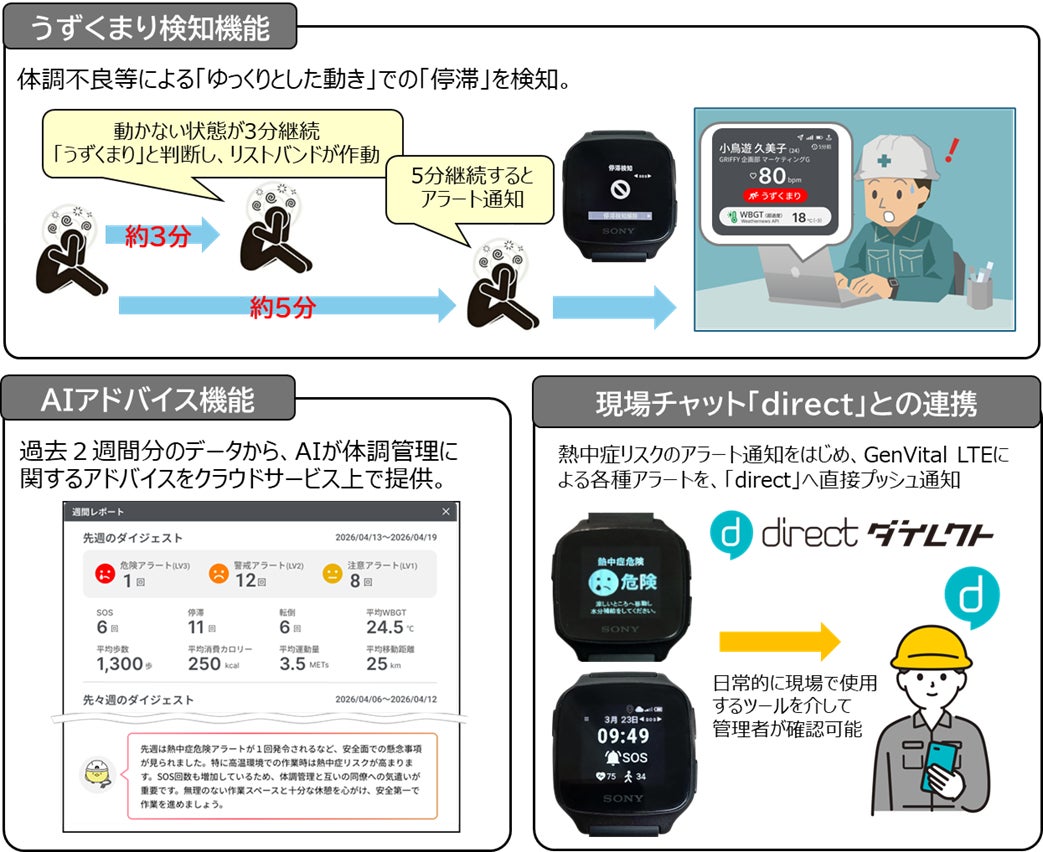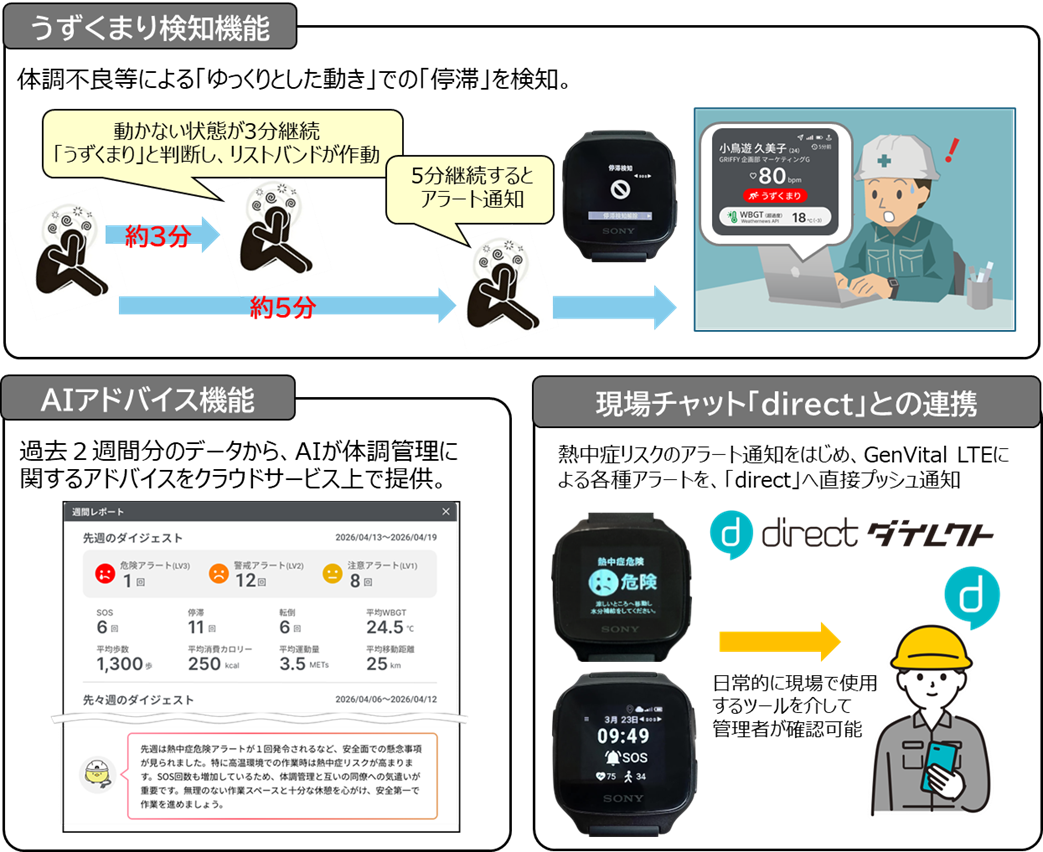 GRIFFY、体調管理ソリューション「GenVital LTE」に「うずくまり検知」「AIアドバイス」「現場チャット『direct』との連携」を機能追加