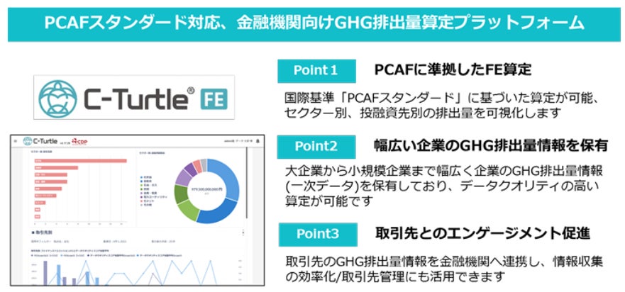 「C-Turtle® FE」は、調達先の削減努力を自社のScope3排出量の削減効果として取り込むことができる「総排出量配分方式」を採用するGHG排出量可視化ソリューション「C-Turtle®」の新サービスとして、金融機関の国際的な排出算定基準である「PCAF※3スタンダード」に準拠し、投融資先のファイナンスド・エミッションの可視化・削減を支援するプラットフォームです。