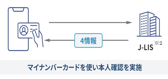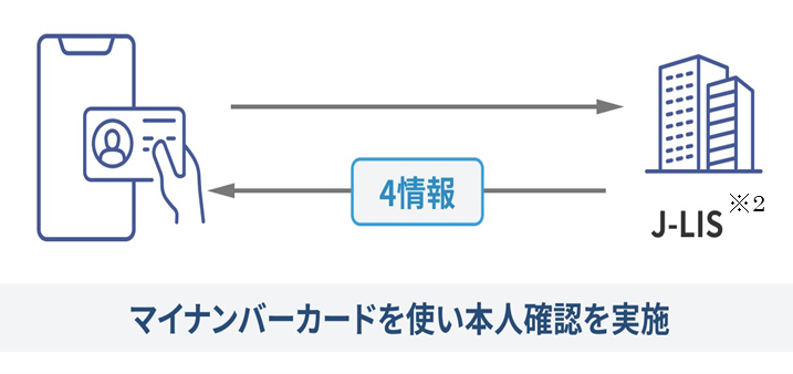 本サービスでは、マイナンバーカードと、デジタル認証アプリもしくはxIDアプリを利用して、高いセキュリティ環境の中で、正確な基本4情報(氏名・住所・性別・生年月日)の取得をすることで、不正や情報入力ミスの防止に繋がり、業務効率および高精度な情報取得を実現しています。さらに今後、xIDアプリでは、J-LIS※2が提供する「最新の利用者情報(4情報)提供サービス」を組み込むことで、最新情報をいつでも取得し、反映できるようになります。