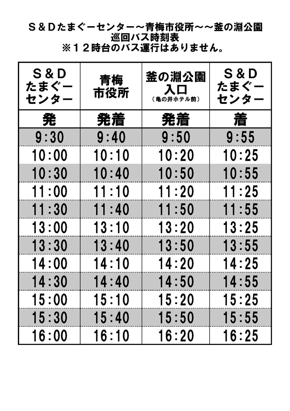 ・駐車場に限りがありますので公共交通機関をご利用ください。 ・S&Dたまぐーセンターと釜の淵公園、市役所間で巡回バスが走ります。午前9 時30分にS&Dたまぐーセンターを出発し、午後4時25分にS&Dたまぐー センターに戻るまでの間、30分間隔で巡回します。(午後0時台のバスはあり ません。) |