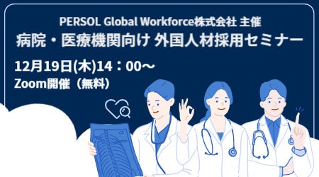 パーソルグループで外国人材に特化した人材サービスを提供するPERSOL Global Workforce(パーソル グローバルワークフォース)株式会社(本社:東京都港区、代表取締役社長:多田 盛弘)は、12月19日(木)に病院・医療機関向けの「外国人材採用」に関するオンラインセミナーを開催します。なお、本セミナーの参加費用は無料です。