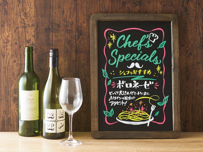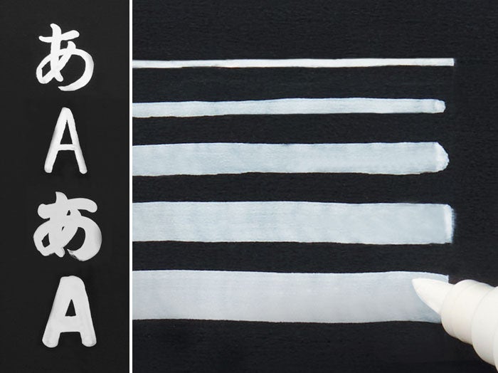 とめ、はね、はらいがしっかり表現できるため、漢字、ひらがなで書く、和食店のおしながきメニューボードや書道の練習にも最適。また、ペン先の力加減で文字や線の太さが自由に変えられるので、英字の筆記体で書く、洋食店、カフェなどのおすすめメニューボードや結婚式のウェルカムボードにもおすすめです。