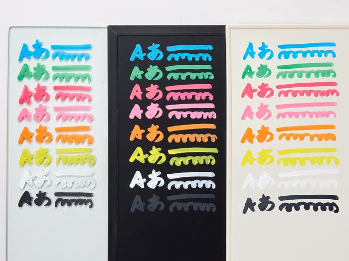 ブラックボード、ホワイトボード、ガラス、アクリルに筆記でき、水拭きで簡単消字可能。全8色カラー。