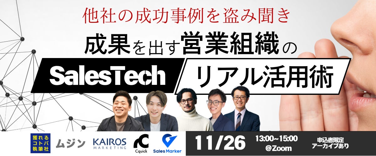 企業の成長にフィットする、MA/SFA一体型プラットフォーム「Kairos3(カイロススリー)」を提供するカイロスマーケティング株式会社(本社:東京都渋谷区、代表取締役:佐宗 大介、以下「当社」)は、株式会社Cquick、ムジン株式会社が主催するオンラインセミナー「成果を出す営業組織のSalesTechリアル活用術」に当社取締役 COO 白井 則行が登壇することをお知らせします。