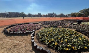 春開催に向けて、現在会場にある花壇の花をつぼみだけを残して一部を摘み取り、フェア会場を彩る花壇作りに銭湯関係者が参加いたします。
