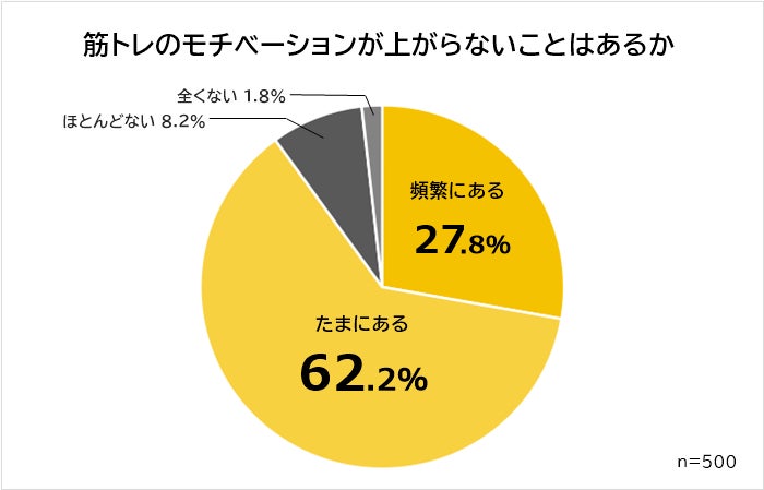 筋トレのモチベーションが上がらないことが「頻繁にある」「たまにある」と回答した人は合わせて90.0%でした。ほとんどの人が、モチベーションが下がってしまう経験をしています。