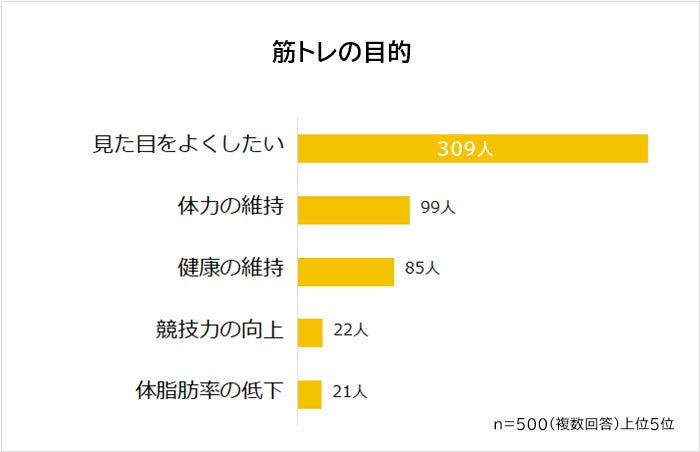 筋トレをしている500人に筋トレの目的を聞いたところ、圧倒的1位は「見た目をよくしたい(309人)」でした。見た目を変えたり、キープしたりするために筋トレしている人が6割以上を占めています。