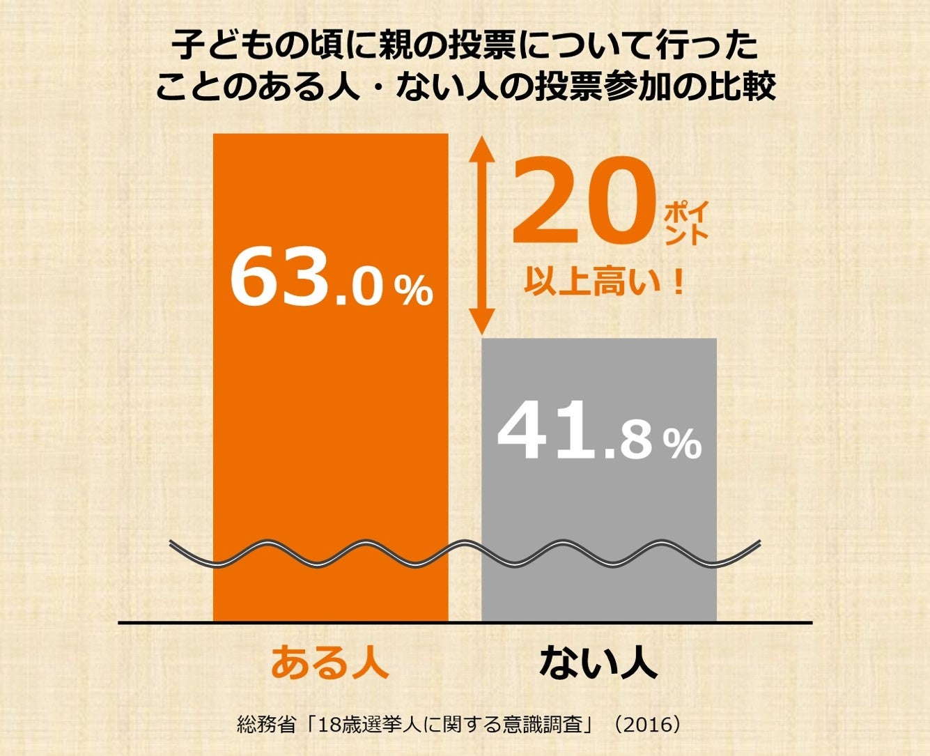 総務省が2016年に実施した「18歳選挙人に関する意識調査」では、子どもの頃に親が行く投票について行ったことがある人の方が、ついて行ったことのない人と比べ、投票をした割合が20ポイント以上高いという結果が出ています。