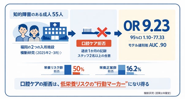 公立大学法人 九州歯科大学(キャンパス:福岡県北九州市、学長:粟野 秀慈) 口腔保健学科 歯科衛生士育成ユニット 泉繭依講師らの研究グループは、知的障害のある成人の施設入所者55人を対象に、日常ケアの中でみられる「口腔ケアの拒否(歯みがき等への抵抗)」と栄養状態の関連を検討しました。その結果、栄養リスク(MNA-SF※1で判定)がある群では口腔ケア拒否の割合が高く、年齢や性別などを調整しても、拒否がある人は栄養リスクとなるオッズが高いことが示されました。