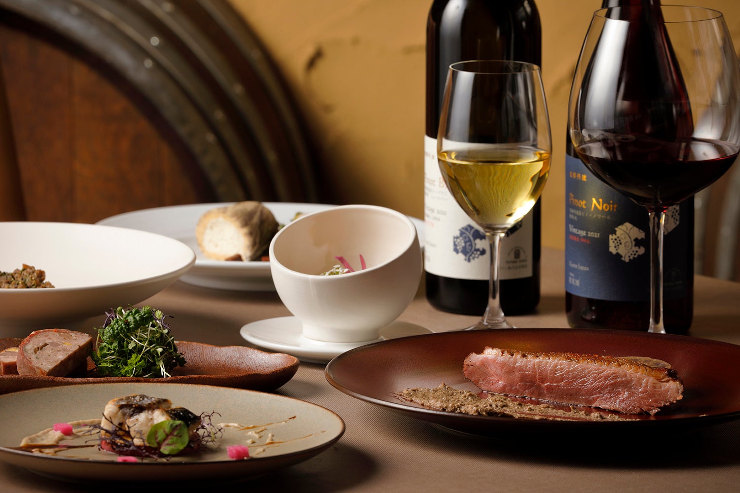 今回の京鴨®ディナーにペアリングするのは「京都丹波メルロー&サンジョベーゼ 2022」。2022年はぶどうの生育期の平均気温が高く、また、降水量は平年と比較すると少なかったため、良質なぶどうが収穫できました。日本での栽培が珍しい品種「サンジョベーゼ」は、キャンティなどイタリアの赤ワインを代表する黒ブドウ品種で、その特徴は軽快な酸味。京都丹波産メルローと共に木樽で熟成させることで、上質な酸味がバランスよく、しっかりとしたボディ感とエレガントさを備えたミディアムボディの赤ワインに仕上がりました。その他にも、ディナーに合わせて丹波ワインが厳選したワインを提供いたします。どうぞお楽しみに。