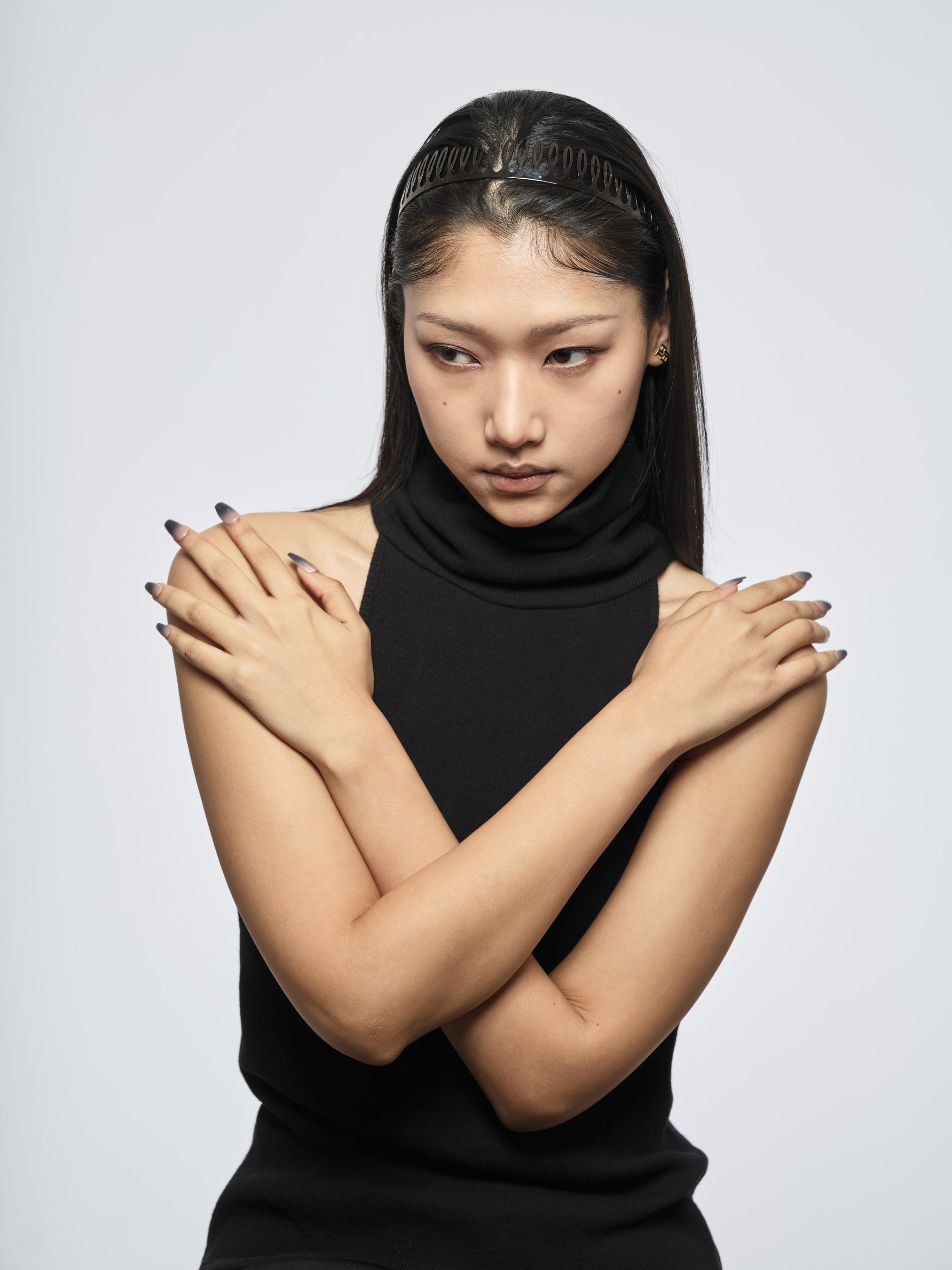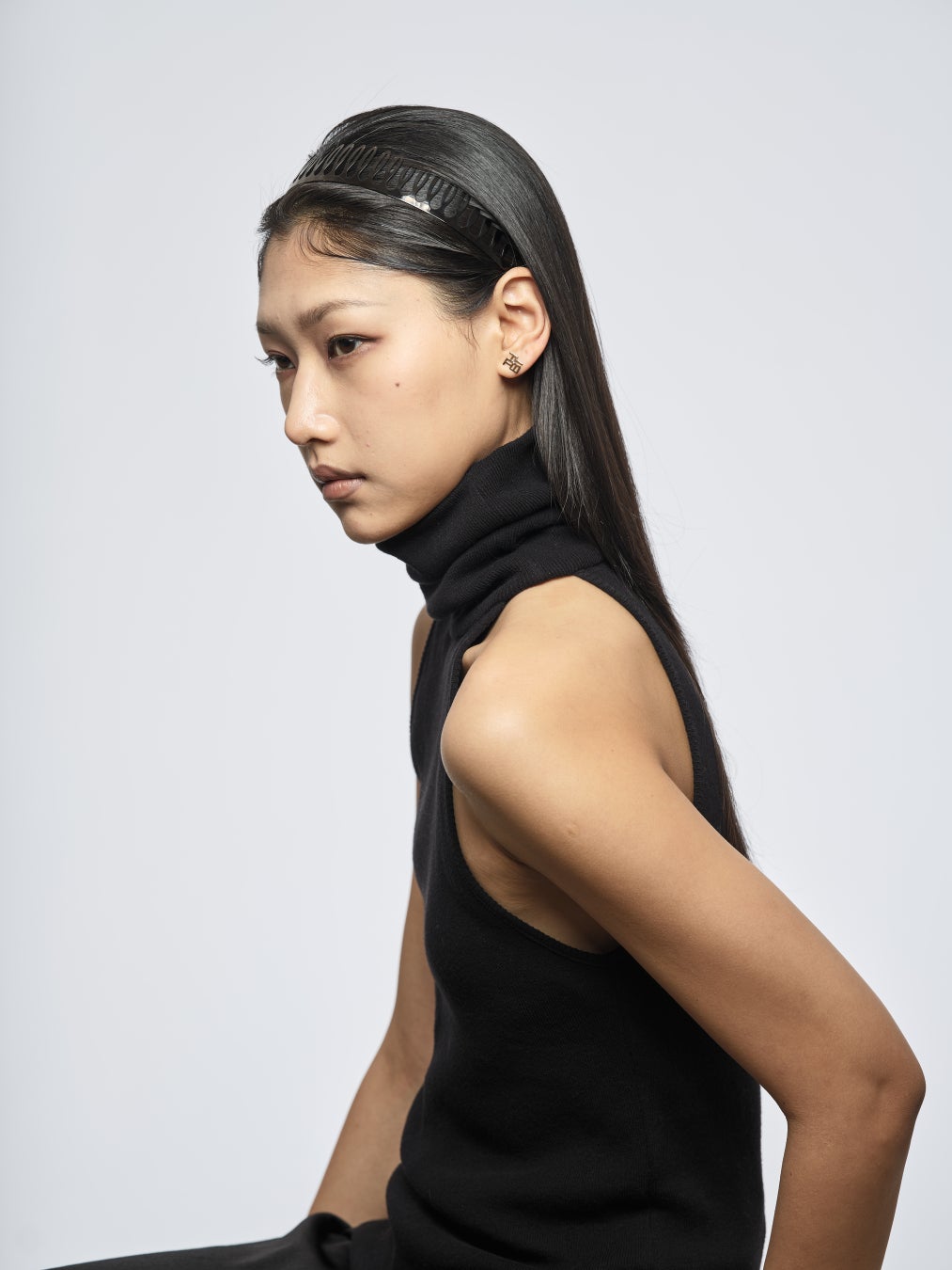 「ℓ」の連なるコームラインを髪に挿し込まず、ただ乗せると造形美が際立ち、存在感を放ちます。