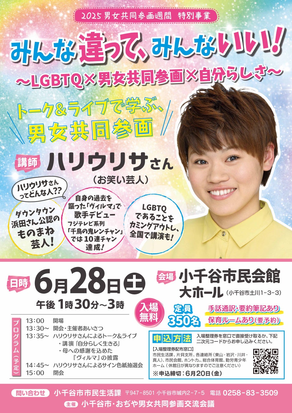 小千谷(おぢや)市は毎年、男女共同参画講演会を行っています。今年は“ダウンタウン浜田さん公認”のものまね芸人として話題のお笑い芸人、ハリウリサさんを講師に迎え、「みんな違って、みんないい!~LGBTQ×男女共同参画×自分らしさ~」をテーマにしたイベントを男女共同参画週間に合わせた6月28日に小千谷市民会館で開催します。